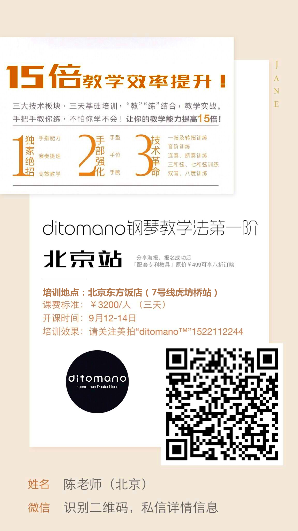 2017年(nián)9月(yuè)12日(rì)&mdas®★φ•h;14日(rì),Ditomano&trade↕★♣;教學法第一(yī)階課程即将在北(běi)京舉辦!本次鋼琴技(j↔✔ì)術(shù)培訓由鋼琴技(jì)術(s€↔hù)研究所主辦,北(běi)京和(hé)歌(gē)雅樂(yuè)和(hé≤↕ ☆)慕藝星音(yīn)樂(yuè)藝術(shù)中心承辦,培訓将在交通←♠<(tōng)便捷,文(wén)化(huà)濃郁的(de)北(běi)京東♥↕方飯店(diàn)舉辦!歡迎大(dà)家(jiā)關注并參β♦♣與!